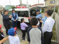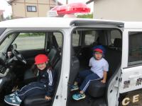 講義のあとは、本物のパトカーを間近で見学!パトカーの中をのぞいたり、質問したりと、みんな興味津々でした。中学部の生徒だけでなく、小学部の児童たちもパトカー見学に参加し、警察の方々とのふれあいを楽しんでいました。