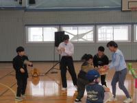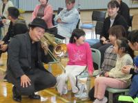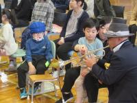 演奏が始まると、子どもたちはリズムに合わせて手拍子したり、体を動かしたりと、ジャズの軽快な音楽を全身で楽しみました。音楽や図工の時間に作った自作の楽器で演奏に参加したり、ノリノリで踊ったりする一方で、ジャズの成り立ちについて真剣に話を聞く姿も見られました。特に、金管楽器から音が発生する際の楽器の振動に驚き、熱心に触れて体感する様子が印象的でした。